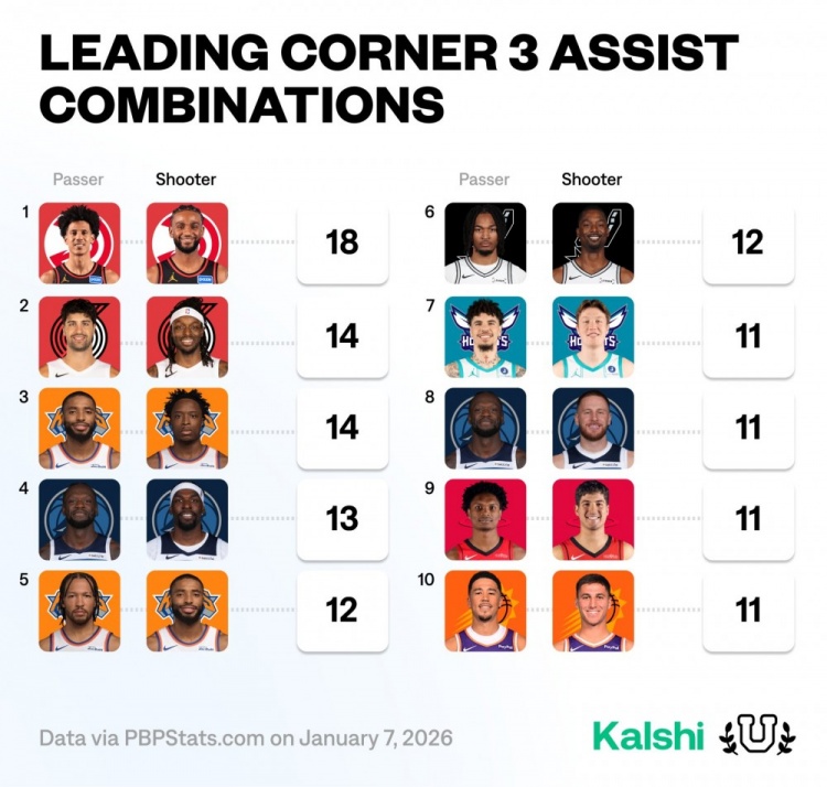PG模拟器-本赛季底角三分传射组合榜:杰伦约+沃克高居第1 阿门+谢泼德上榜